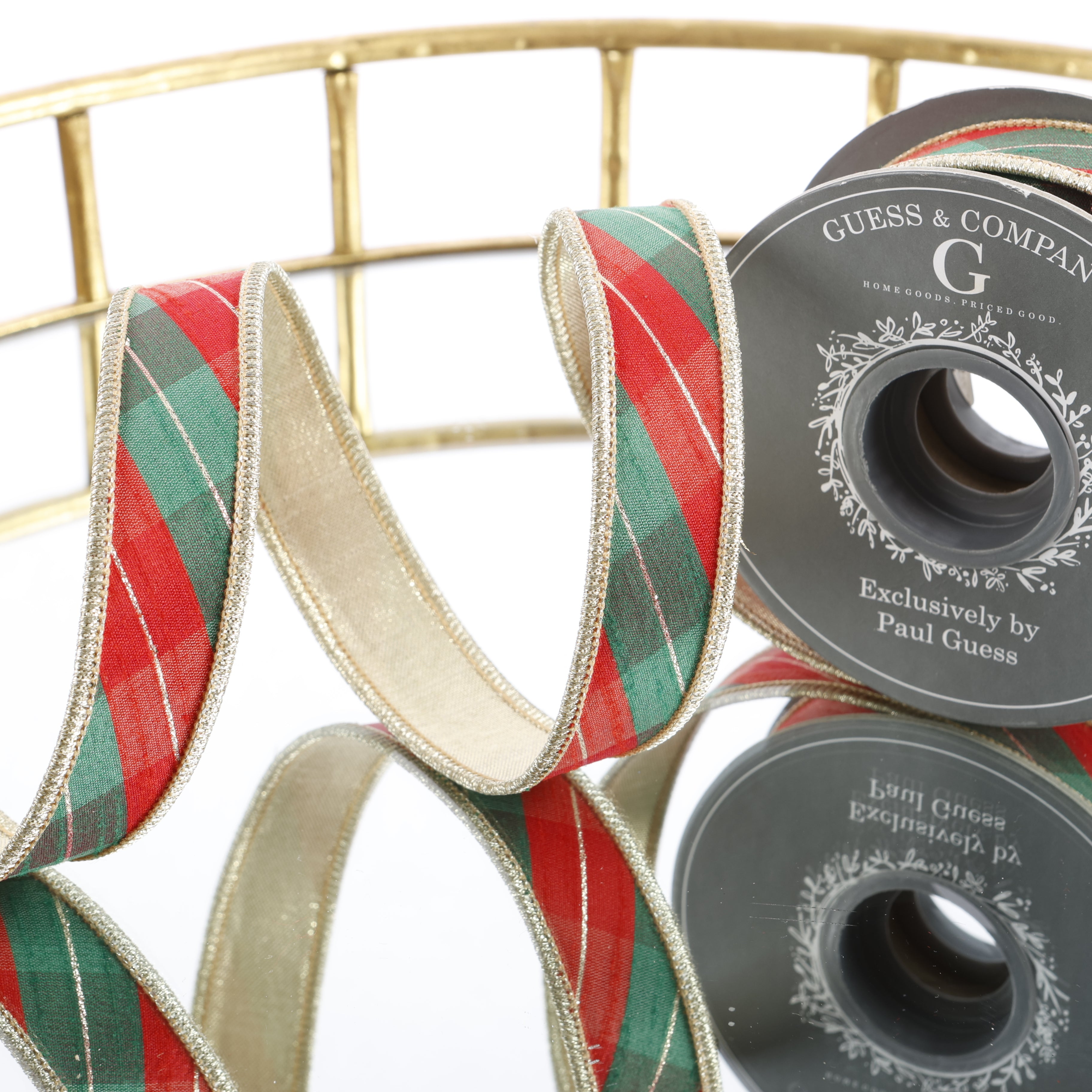 1"X 5 YD RED/GREEN/GOLD DUPION PLAID CHECKS WITH LT GOLD METALLIC DUPION BACK RIBBON