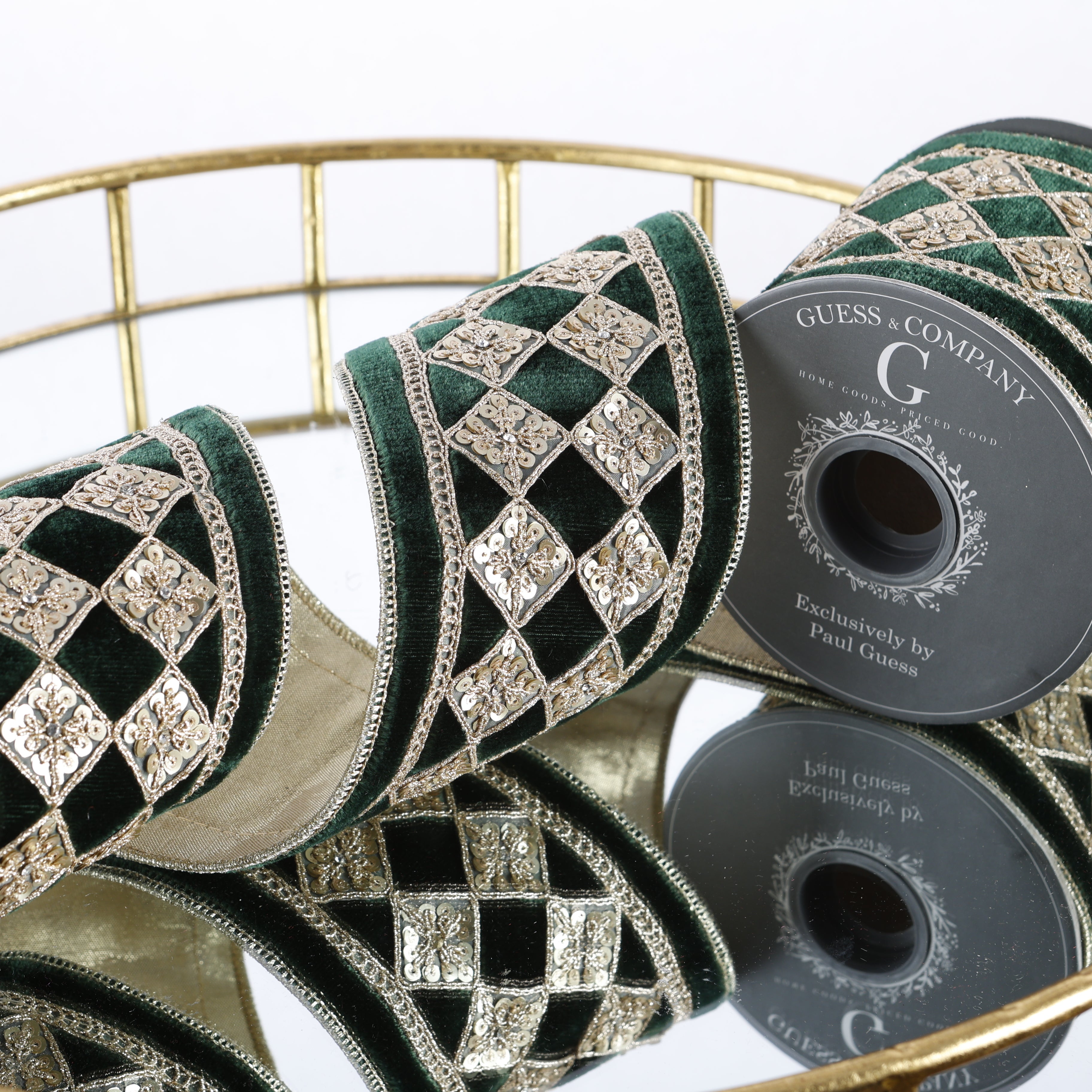 Elevate your décor with this 4-inch dark green velvet ribbon, beautifully accented by a shimmering gold diamond pattern. Its rich texture and elegant design add a luxurious touch to gifts, crafts, and holiday decorations, making every project stand out with sophistication and charm.