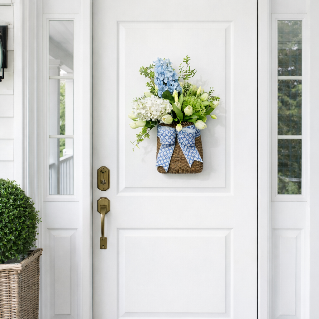 JARAD SIMPSON 25" X 40" BL/GR DOOR HANGER FLORAL DESIGN IN LARGE BASKET WITH BOW