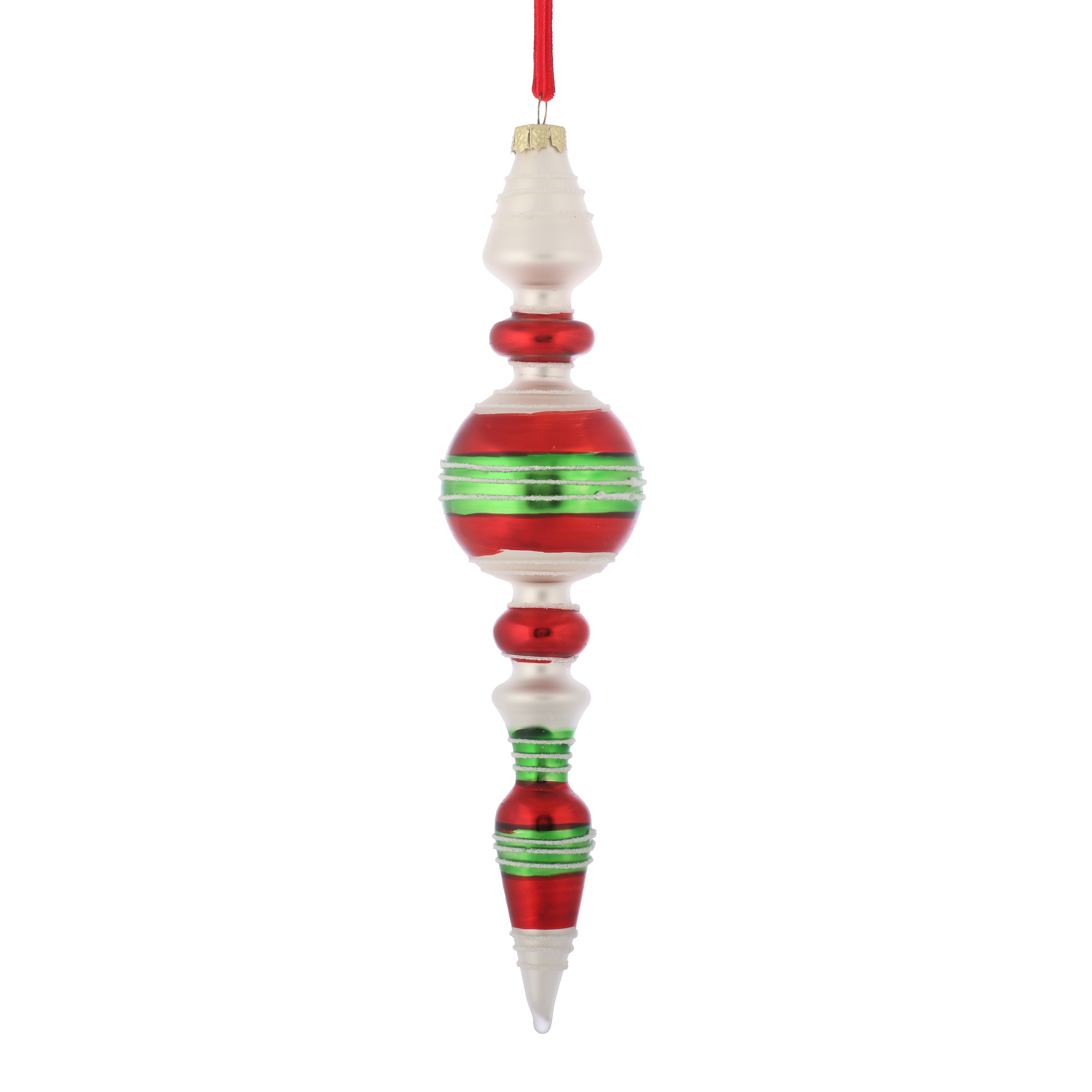 Elevate your holiday décor with this stunning glass finial ornament in vibrant red, green, and white. Measuring 9.5 x 2" and 11 x 1.8", this elegant piece adds a festive touch and timeless charm to any tree or display. Crafted for a brilliant shine, it effortlessly enhances your seasonal ambiance, making every space feel warm and inviting.