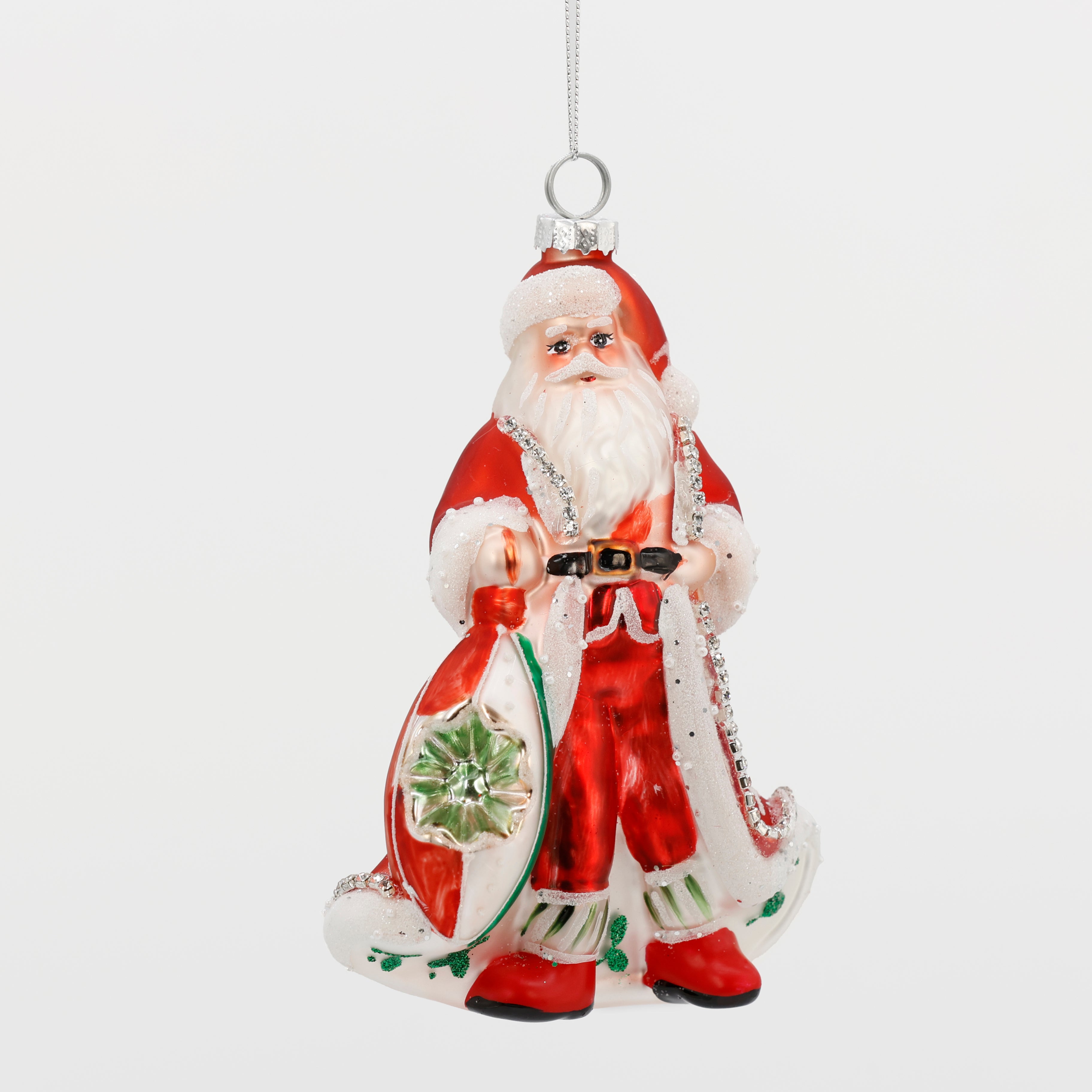 This charming 6.3"x4" glass Santa ornament adds a festive sparkle to your holiday décor. Crafted with delicate glass, it captures the classic warmth and joy of Santa Claus, making it a perfect accent for your tree or holiday display. Its vibrant design and elegant size make it an ideal gift or keepsake to bring holiday cheer year after year.