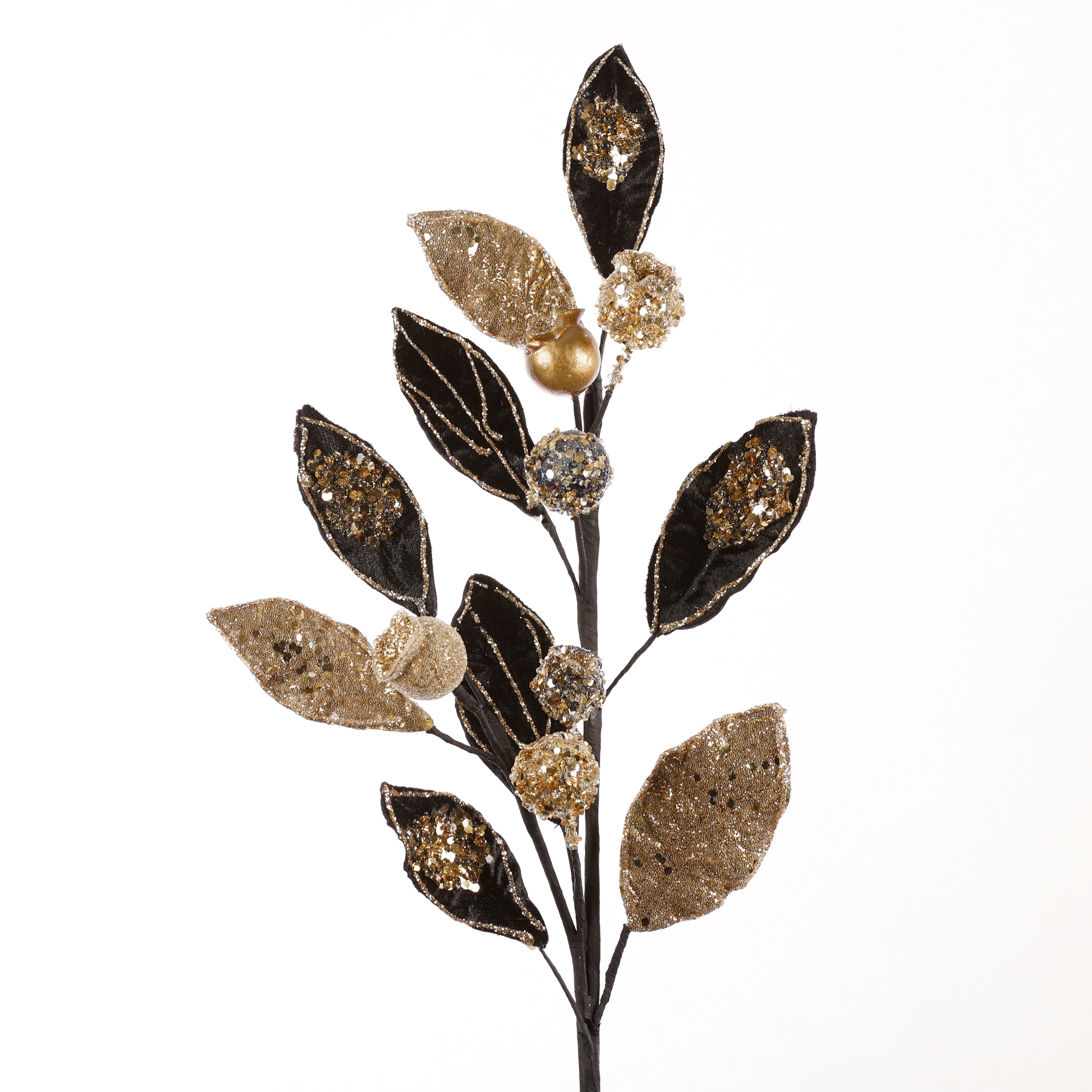 Elevate your décor with this 30-inch black and gold velvet spray accented by jewel berry and salal leaves. Its rich textures and vibrant colors bring a touch of elegance and natural beauty to any space, perfect for enhancing floral arrangements or adding a sophisticated accent to your home or event.
