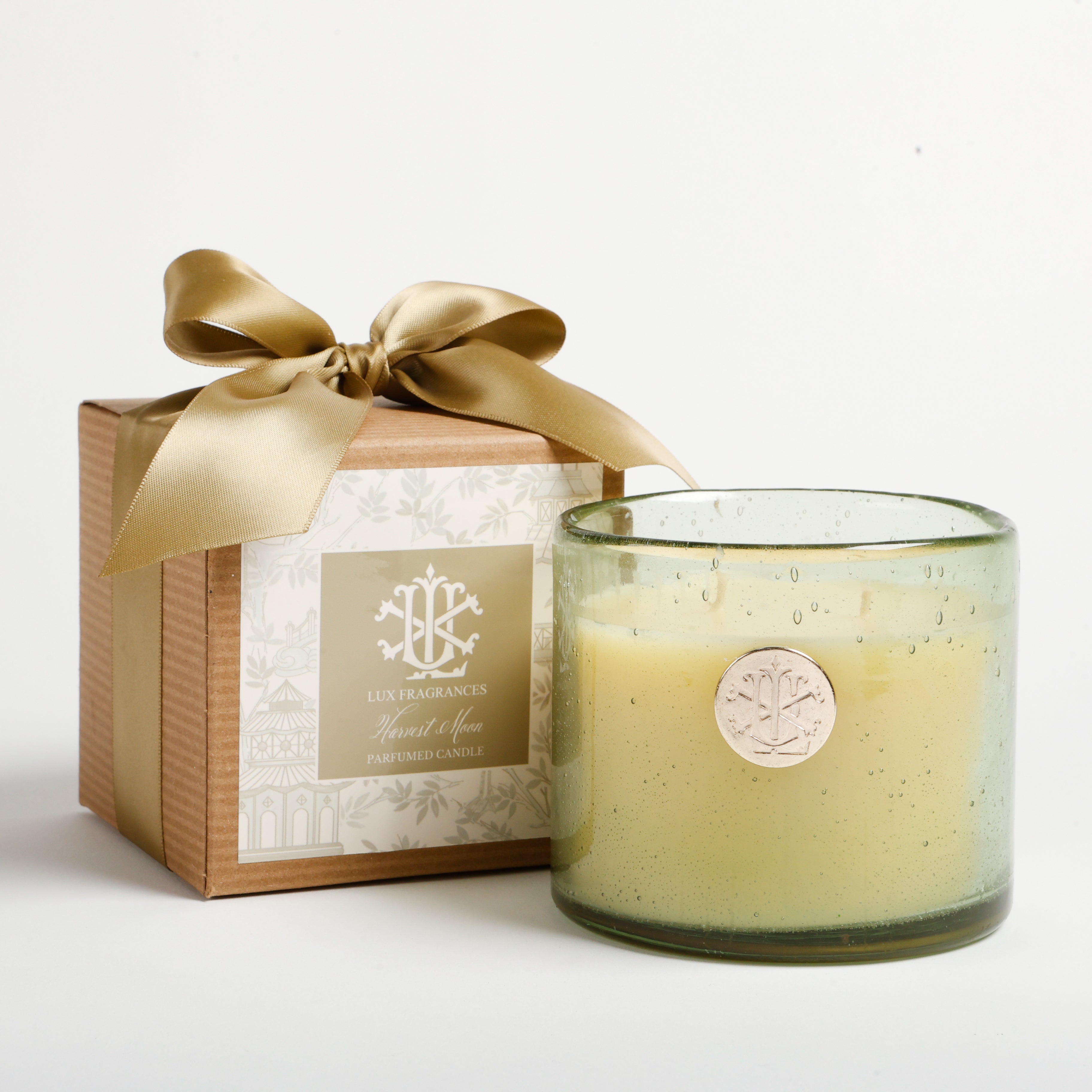 Harvest Moon 13 oz Candle in Green Glass with Bow
