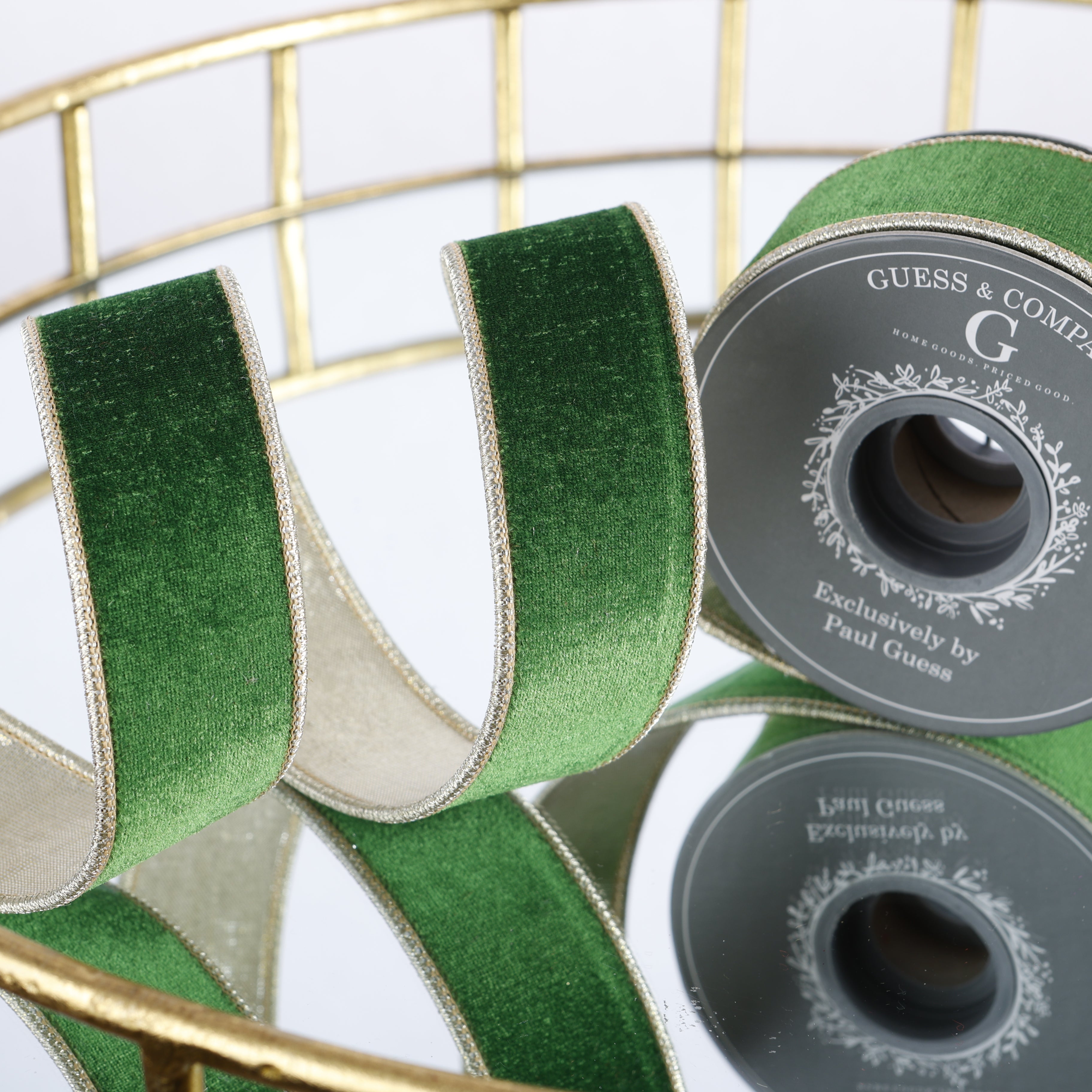 Elevate your projects with this luxurious 1.5" green plush velvet ribbon featuring a subtle light gold backing. Its rich texture and elegant color combination add a sophisticated touch, perfect for gift wrapping, decorations, or crafting that demands a refined finish. Durable yet soft, this velvet ribbon enhances any design with a classic, stylish appeal.