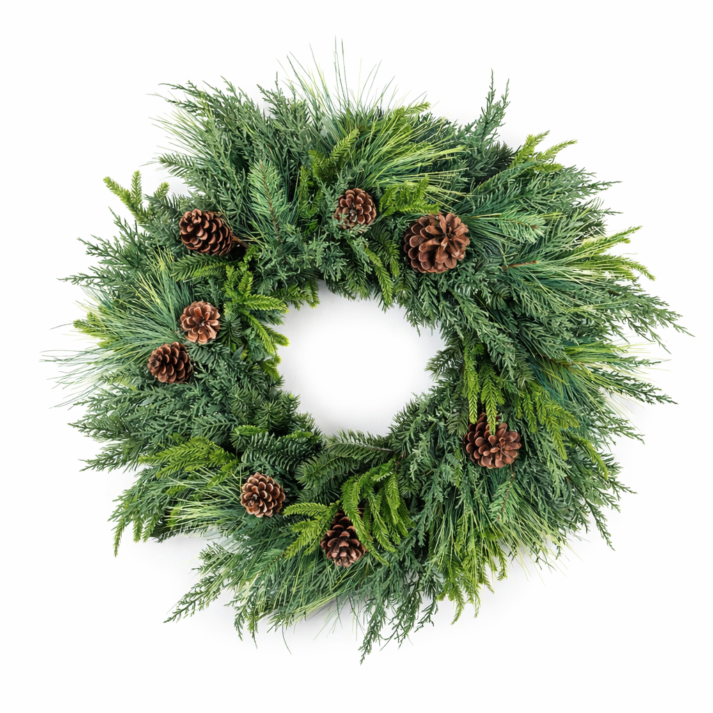 Bring natural elegance to your home with this 28" Gathered Greens Real Touch Wreath. Crafted with lifelike foliage that mimics the texture and appearance of fresh greenery, this wreath adds timeless charm to any entryway, mantel, or wall. The generous 28-inch diameter makes a bold statement while the realistic leaves and stems create an authentic botanical look without the maintenance of live plants. Perfect for seasonal décor or year-round display, this wreath combines durability with sophisticated style.