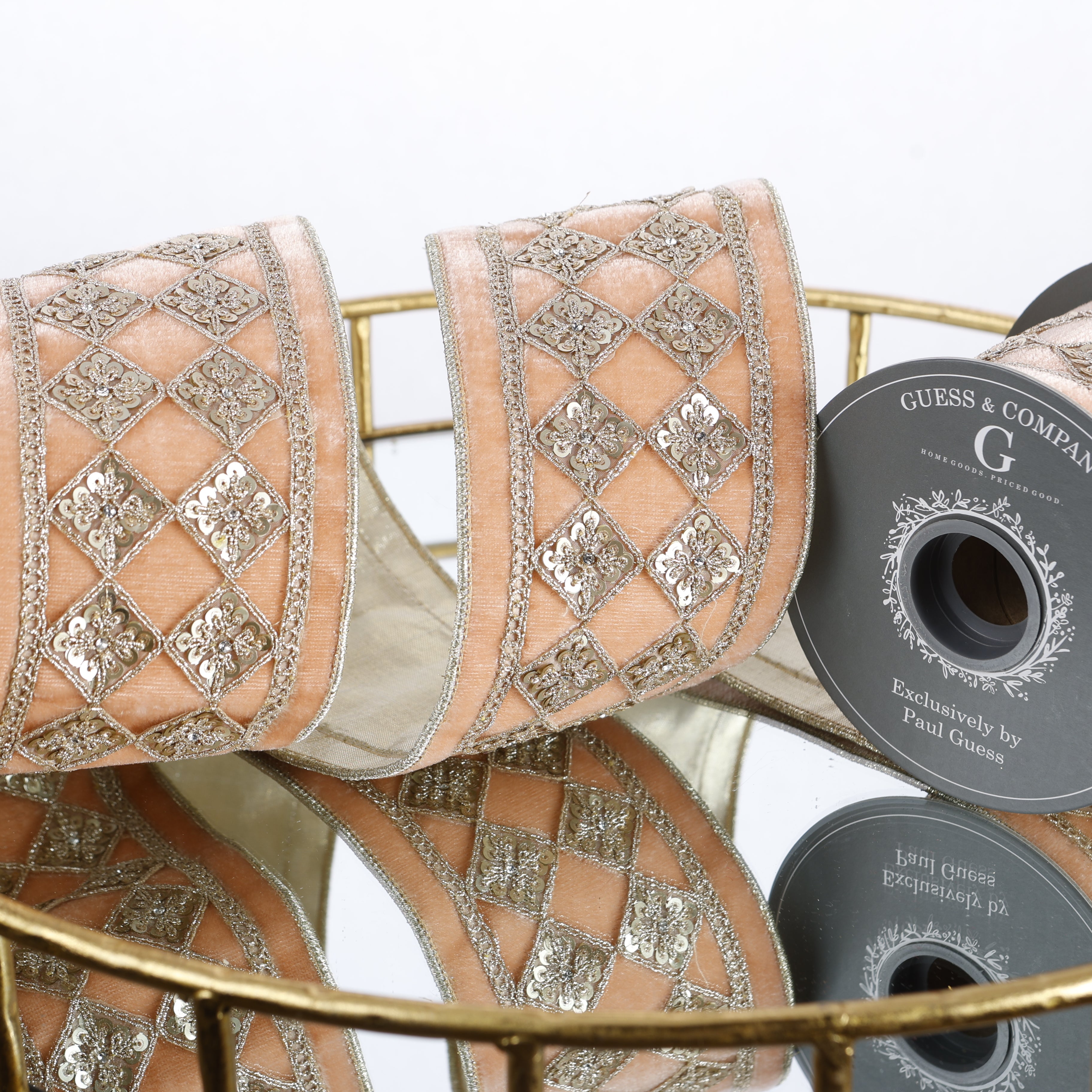 Elevate your decor with this 4" peach velvet ribbon, beautifully accented by a gold diamond dupion back. Its luxurious texture and elegant shimmer make it perfect for gift wrapping, floral arrangements, and crafting projects that demand a touch of sophistication. Add glamour effortlessly while enjoying a ribbon that combines softness with striking design.