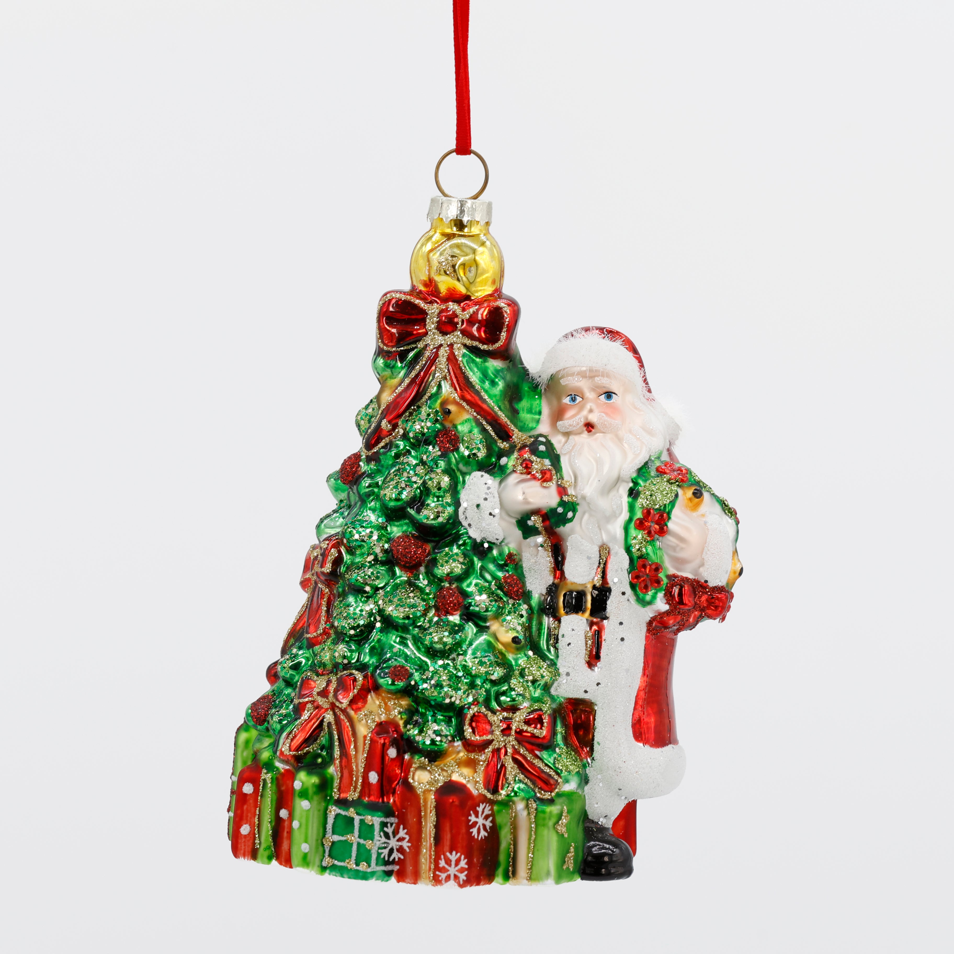 Celebrate the holiday spirit with this charming 6.5"x5.1"x3.5" glass Santa ornament featuring a festive Christmas tree. Its delicate craftsmanship adds a touch of elegance to your decorations, making any space feel warm and joyful. Perfect for enhancing your tree or gifting to loved ones, this ornament brings timeless holiday cheer year after year.