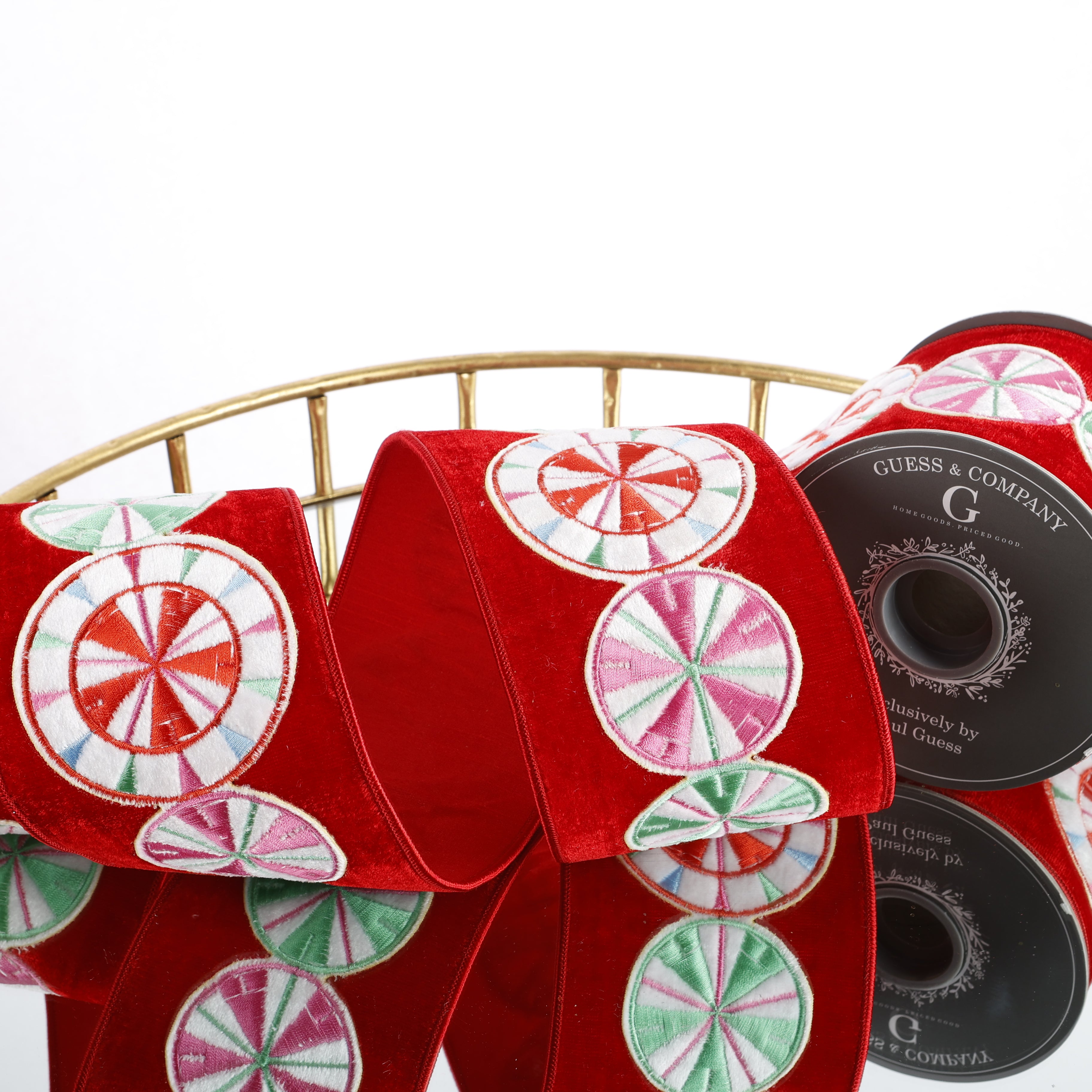 4" X 5 YDS WHITE VEL GREEN EMB HOLLY DUP BACK RIBBON