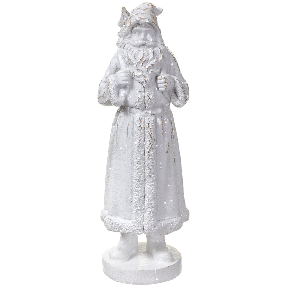 Celebrate the season with this elegant 5.5" Glittered Santa adorned in shimmering white, accompanied by a charming gift box. Its refined sparkle and delicate details bring festive sophistication to any holiday décor, making it a perfect accent piece or thoughtful present to brighten your celebrations.