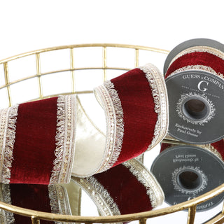4"X 5 YD BURGUNDY VELVET WITH GOLD DIAMOND DUPION BACKED RIBBON